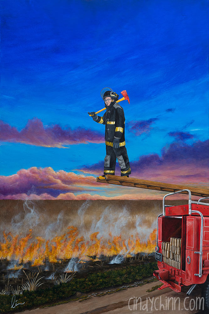 In this painting, he is elevated above the flames to show his dominion over them. He has walked out on the ladder to show the risk involved, yet is still relaxed and confident.