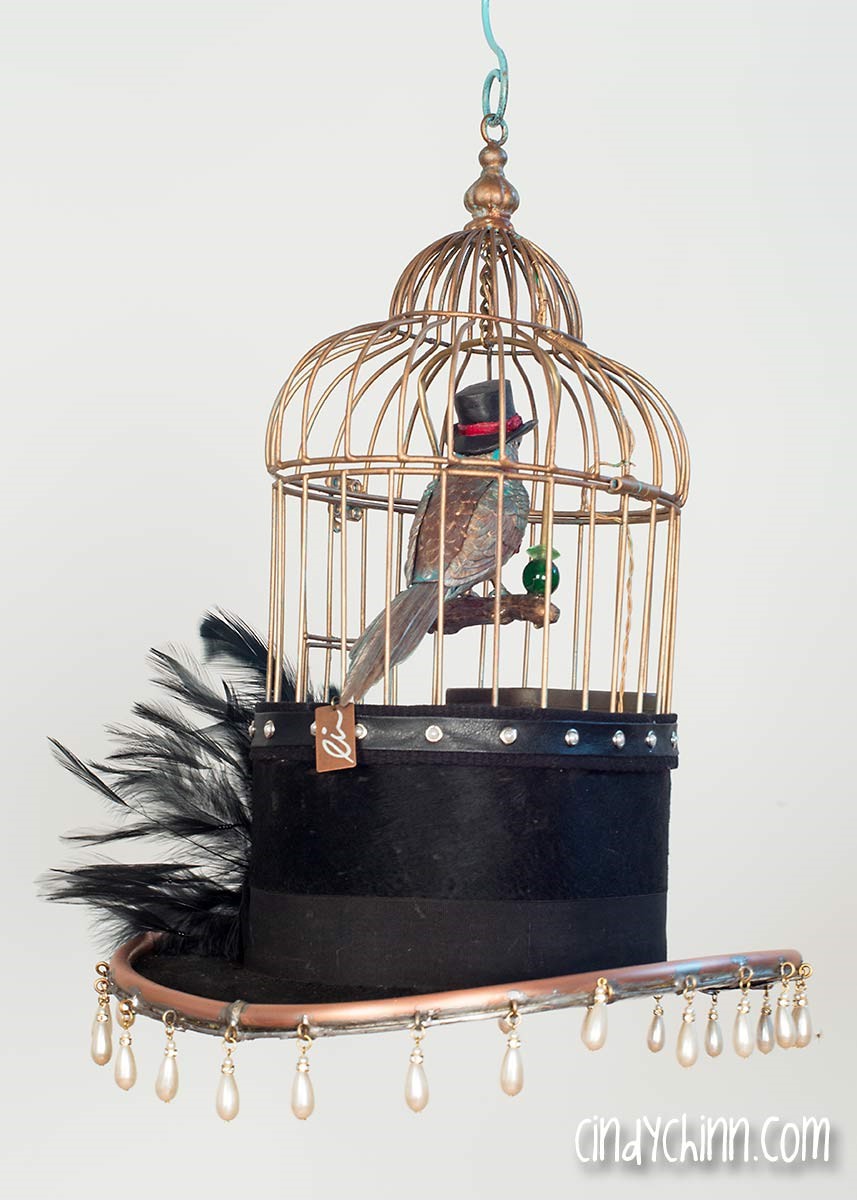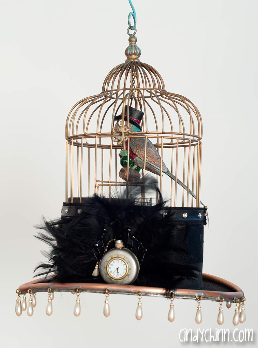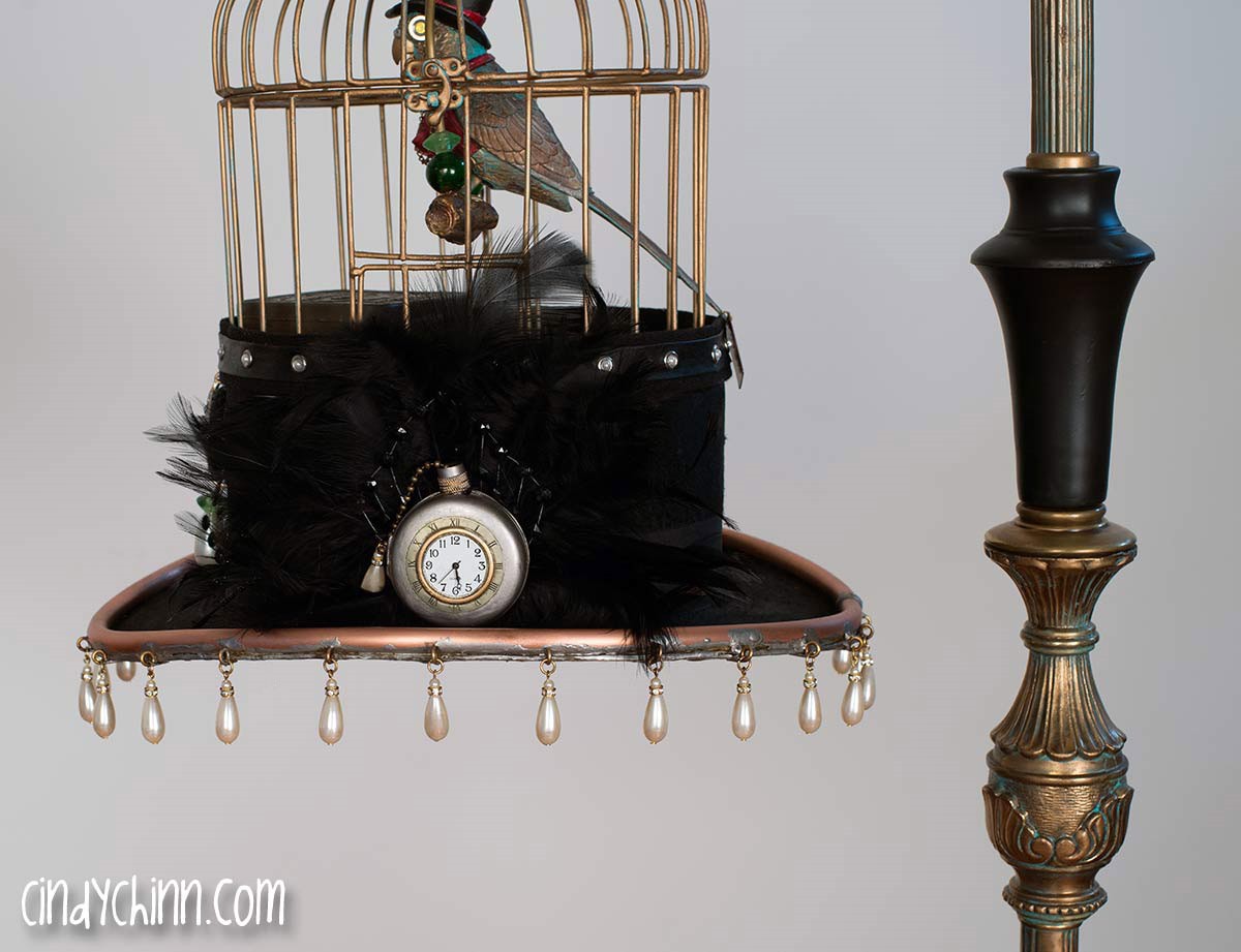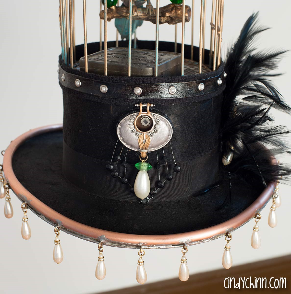 I love finding new ways to create wearable art. I've made a number of altered vests and jackets over the years, and now I'm finding that hats make a great base for a project. This started out as an older top hat, but after I added the birdcage and the mechanical moving bird, it all came together in to a fun, steam punk type piece.