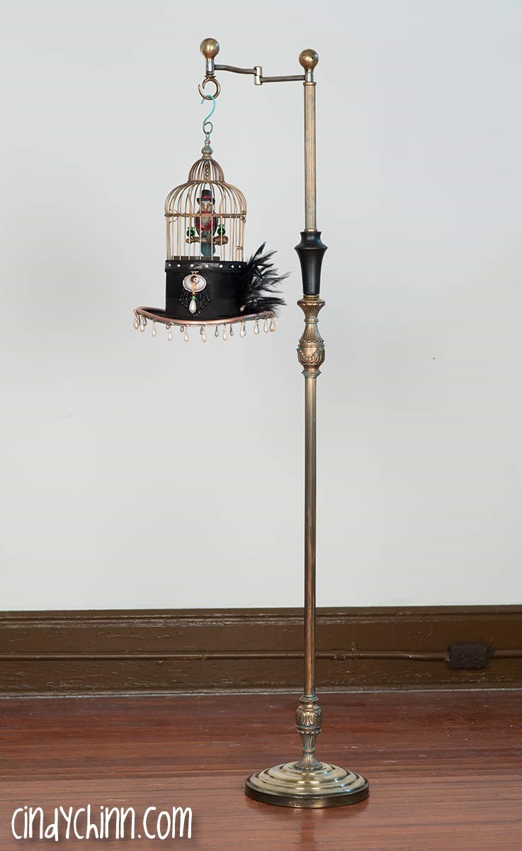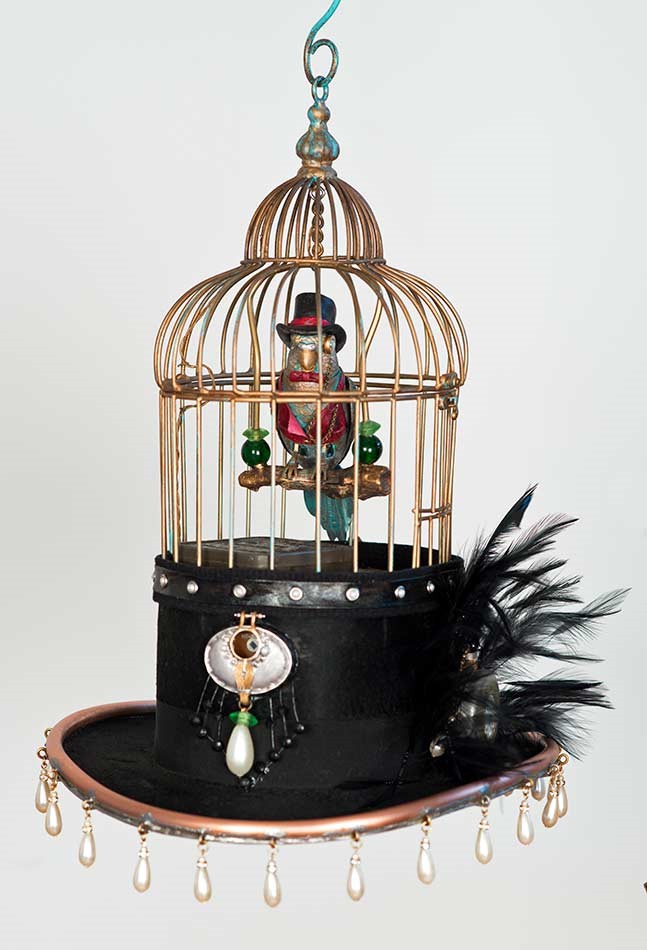 Hat, wire bird cage, mechanical bird, polymer clay, feathers and other materials.
