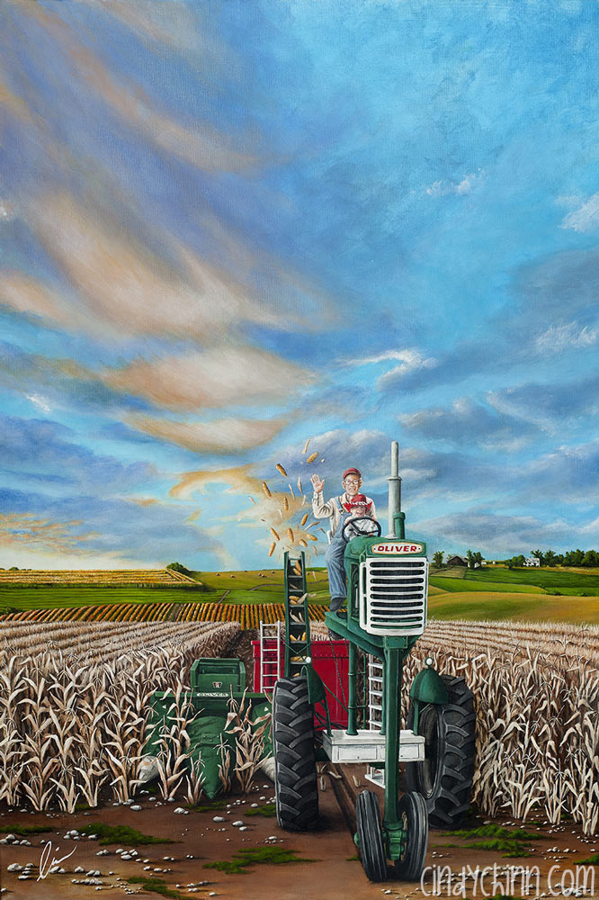 The son is his future and what he brings with him. In the background we see the family homestead, the foundation of his moral values. Along his path we see fields of crops, gone but not forgotten. |