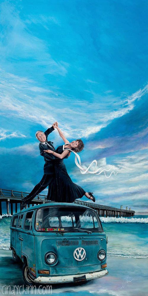 It was love at first sight for this couple, married 50 years now. This painting represents their love for each other, the beach at Cayucos, CA., the years of dance lessons, Phil’s love of his old beat up VW Bus, Irene’s tolerance of that same bus.