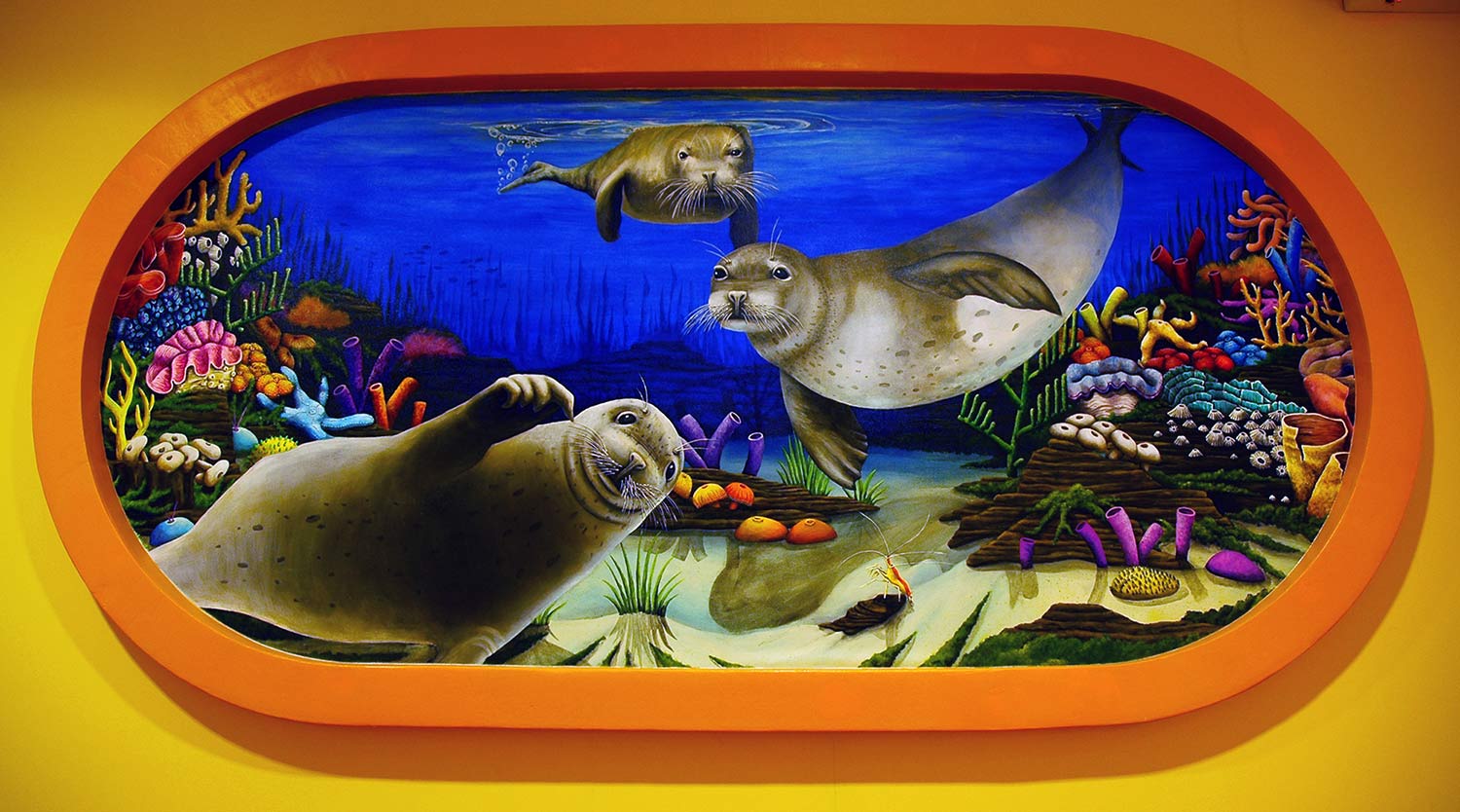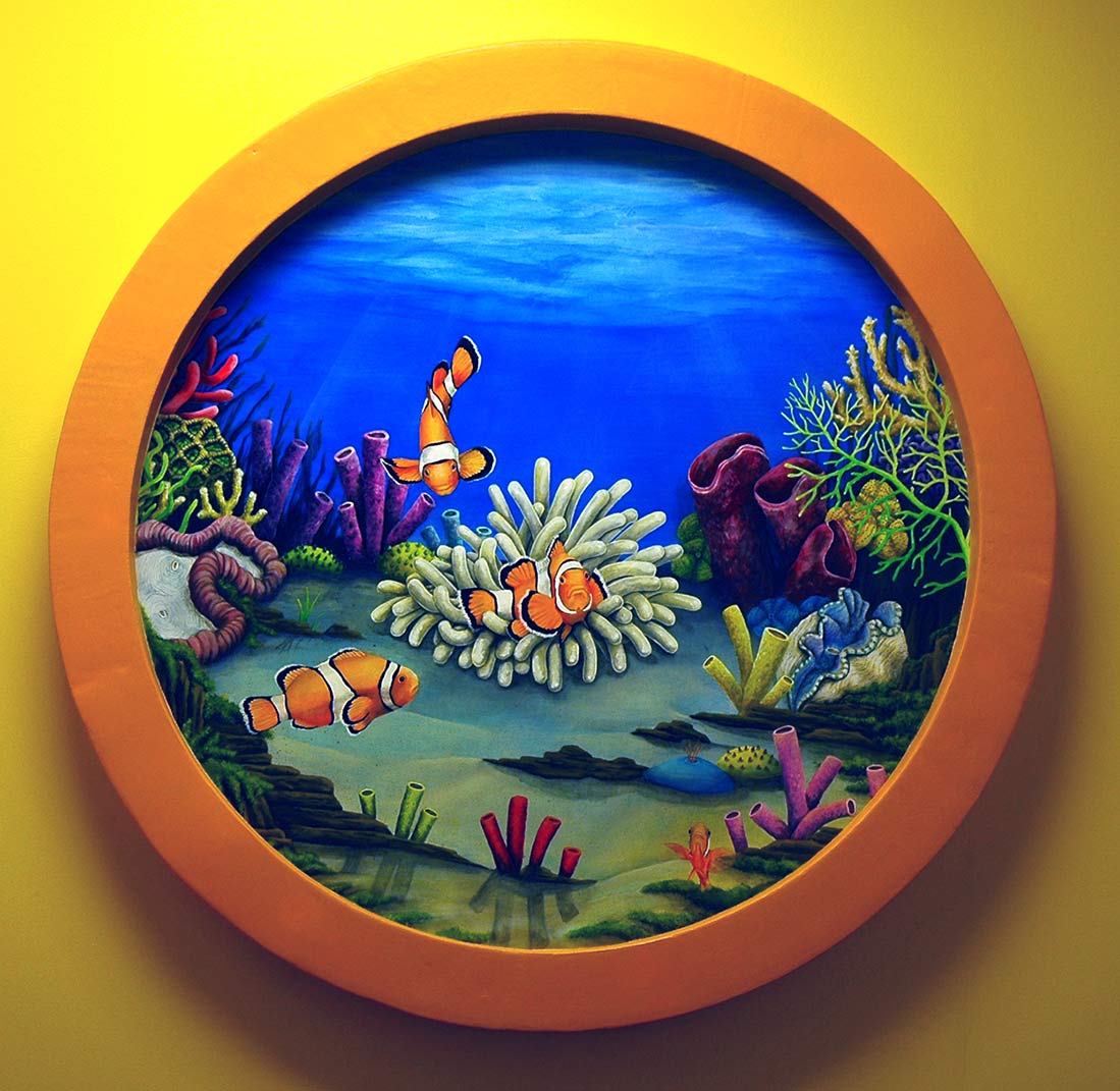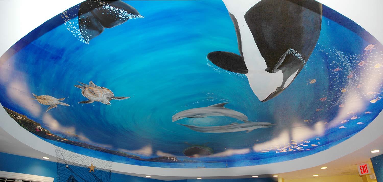 I was commissioned by a dentist to provide murals for a new office. He loved the look of the hospital murals and wanted something similar for his office. He worked with kids and wanted a bright, fun environment to make them feel welcome. I painted a 4'x4' mural, a 4'x8' mural as well as 25' circular ceiling mural on canvas. Then I traveled to Charlotte and installed the pieces.