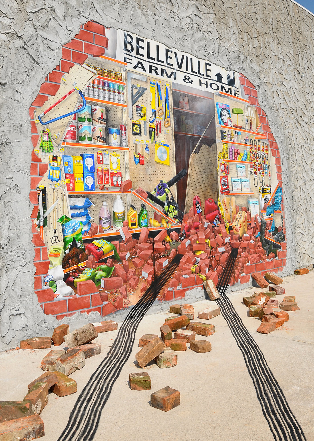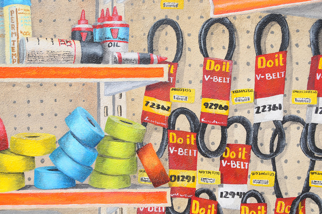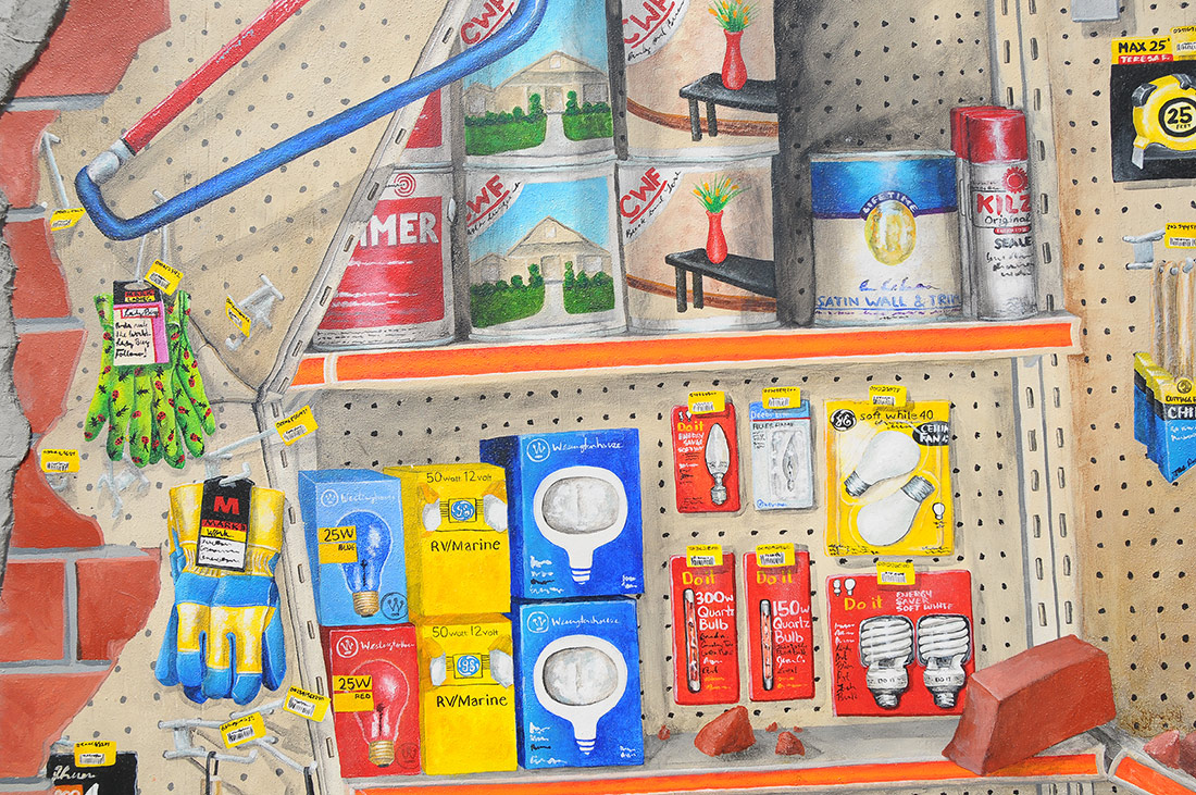 This is mural done for a local hardware store that wanted an attraction. I painted the mural on 3 sheets of 4x8 plywood and then installed the mural on a exterior wall.