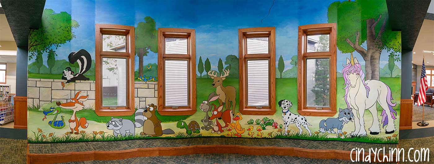 Check out my blog page for this project so you can see all of the in progress photos and videos - and even download a coloring book with the mural characters!