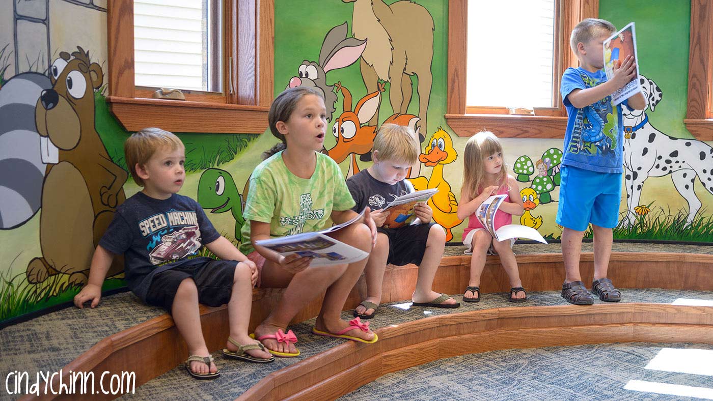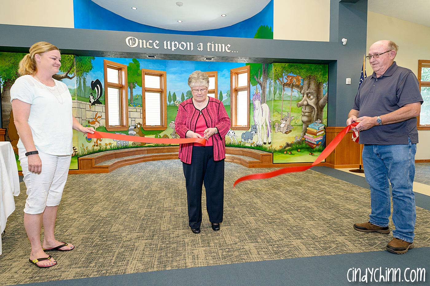 One of the keys to my design was to keep most of the characters at 'kid level' I envisioned them sitting on the steps while reading and surrounded by their woodland friends. After the dedication I was able to see how well this works.