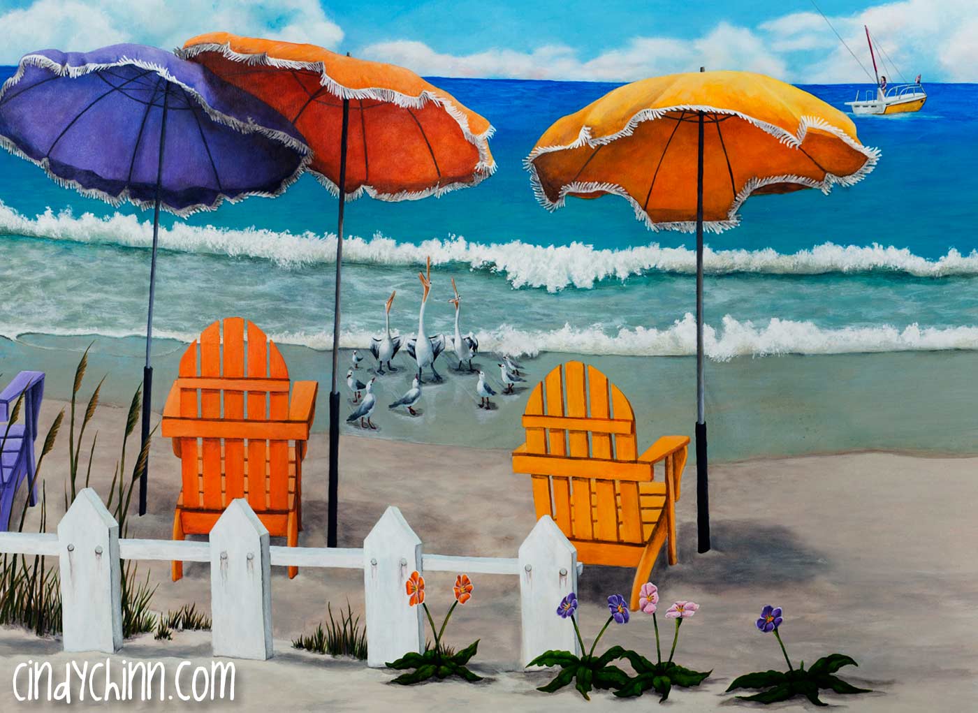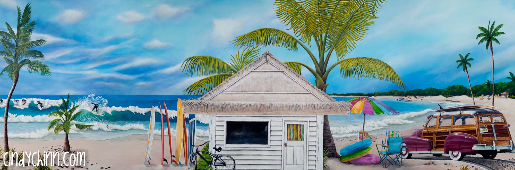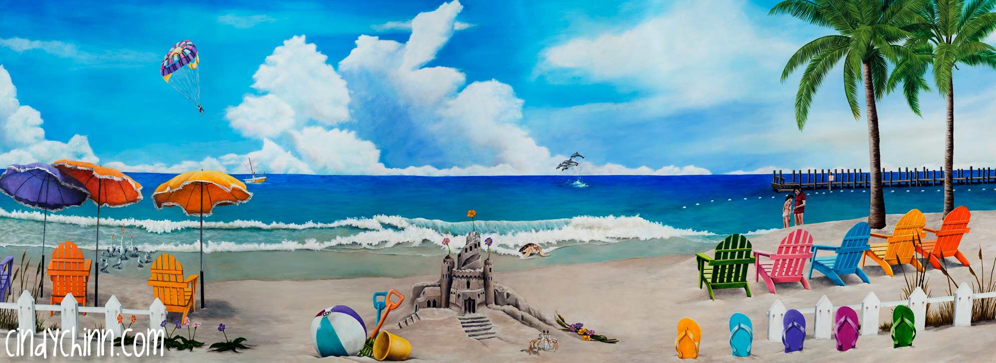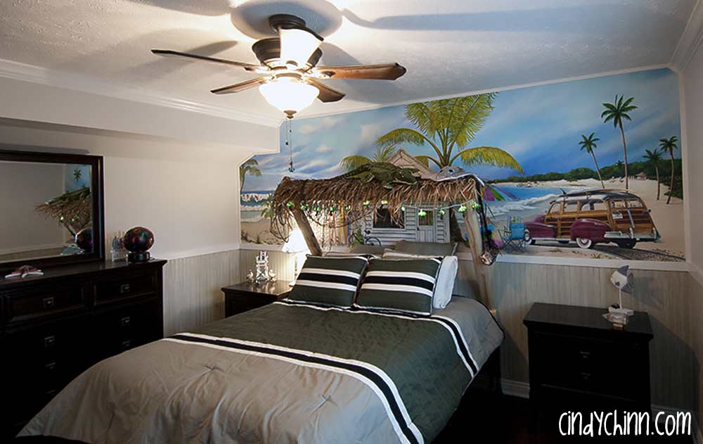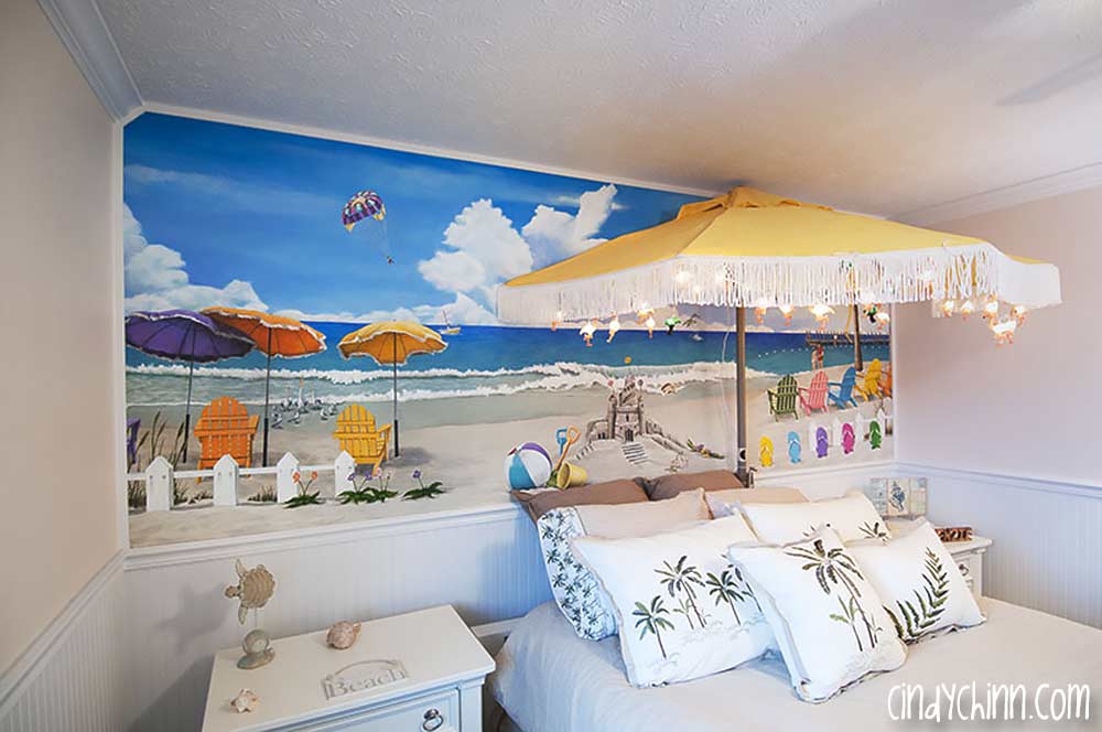 The mother then worked a whole room design around the murals and I added some elements as well. In the girl's room I added a colorful 1/2 beach umbrella with lights. In the boy's room, I added a beach shack complete with fishing net and shells.
