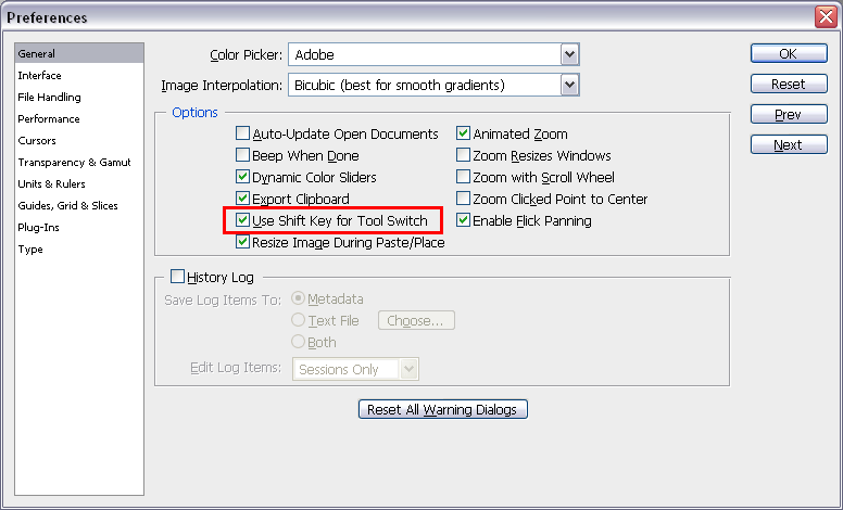 Tip: See the "M" to the right of the fly out? Let's say that you have the eyedropper selected and you want to use the marquee tool... hold down the SHIFT key and hit the "M" key on your keyboard. You will see that the marquee tool is now your active tool. This is a handy quick keyboard command and most of the tools have them (if it doesn't work, you will need to turn it on in Edit > Preferences > General drop down menu found on the menu bar). Once you get familiar with the shortcuts, people will think that you "fly". |