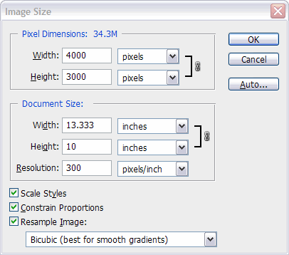 When you change the resolution size, the Pixel Dimensions automatically change too (960x720). For this application though, we will also change the pixel size to 800x600 pixels. See the bracket and chain on the right? That will allow you to change the size proportionately. If you click on the chain it will turn this off and you can force the size to what ever you like. (Or you can uncheck the "Constrain Proportions" at the bottom)