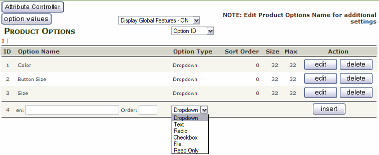 In this example, some have already been added, but on line 4, a new option can be added. You can also enter a Sort Order. You can also select the method that the customer will use to select the option value. Using a Droplist is an easy way to provide the list, while not taking up a lot of screen space. Once you have the Name, Order and Type, press You might it easier to organize if you create Option Names like "Shirt Size" or "Shirt Color" so that you can be more specific to the products. Adding more detail and flexibility is always a good plan. This page has a lot of other info on it, but for now, just ignore it.