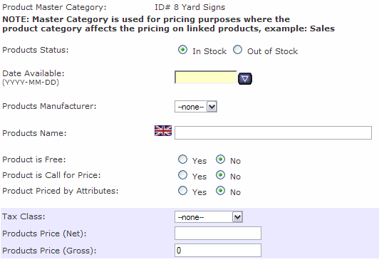 Most of these symbols should make sense to you - especially if you remember them from the Categories list. We'll look at the new ones later, but first we'll look at creating a product. Remember what I wrote above about having information before you start this? It will be faster and you'll have less errors if you are prepared before you start defining a new product. Click Filling out this form should be straightforward for the most part. From the top, you'll see your "Product Master Category" - this is the category that your new product will be 'filed' under. Product Status will usually be "In Stock", but you can create products before you receive or manufacture them and have their status as "Out of Stock". Of they are Out of Stock, indicate a "Date Available", or leave blank if the product is "In Stock". Product Manufacturer: This droplist will be populated with a list of Manufacturers that you have already created. If you make all of your own products, this could be left blank. Product Name: This should be an accurate and brief name that clearly describes the product. Product is Free: (not in my store!) Use this for samples or other giveaways. Call for Price: This is used for products that may be subject to a market price, or a highly competitive product whose price you don't want to advertise. Product is priced by attributes: Only used when products have all different prices based upon their attributes. Not used much, as you can set some attributes to have a surcharge (example: XXL shirts sell for $2 more). Tax Class: Most products are affected by sales tax, so choose the "Taxable Goods" option if this applies to the product. Product Price (Net): This is your selling price. Product Price (Gross): This will update to your selling price + sales tax.