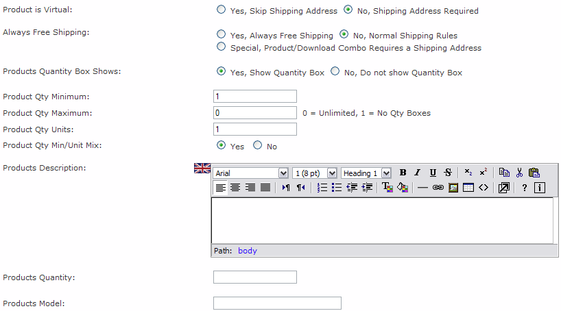 Product is Virtual: Use this for items that can be downloaded and will not be shipped. Always Free Shipping: Will Free Shipping apply to this product? If not, then check "No, Normal Shipping Rules". Products Quantity Box Shows: Choose Yes for most products so that customers can choose how many they want to order. Product Qty Minimum: What is the minimum quantity of this product that your customer can order. Some items might be sold only in case quantities. Product Qty Maximum: If you want to limit how many a customer would buy, enter it here. Product Qty Units: Most items will be sold individually, but some items might be sold in groups (Example: 4 shock absorbers sold together). Product Qty Min/Unit Mix: This would be used if you want to 'mix and match' attributes (Example: pick 3 kinds of cookies to make up a dozen). Product Description: This is where you write about the features and selling points of your product. Give as much information as possible to help your customer make an informed decision and save frequent emails regarding products. In the example above, the HTMLarea option is shown. Product Quantity: This is the number that you have in stock/inventory. You must have a quantity of 1 or more to be able to sell your product. Be careful not to forget this one or customers will not be able to buy your product! Product Model: This is the model or inventory number of your product. This could also be a manufacturer's product number if you don't use your own inventory numbering system.