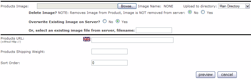 Upload to directory: Make sure you select the correct directory to upload your new image to. If you forget, you're file system will become an unmanageable mess. Directories can be created using an FTP program. Delete Image: Generally this will be defaulted and left at No. Overwrite Existing Image on Server: Since you are using a good naming system for your files, you can leave this at Yes. If you are editing your product and upload an new image, you can overwrite the old image with the new one. Or, select an existing image file from server, filename: If you have already uploaded all of your images, you can manually enter the name here. In most cases it would be best to just upload the image to avoid any errors of manual entry. Products URL: If you are selling a product from a manufacturer that has a page for your product, it can be good for your customers to find more or updated information on the manufacturer's page. Do not add the http:// in the text box. Products Shipping Weight: Enter the the weight of the product in it's packaging. This will be used for calculating the shipping when the customer checks out. A Tare can be added in Configuration/Shipping / Packaging to add in additional packing materials needed to ship the product. Don't forget to enter this value, or you will lose money on shipping! Sort Order: A default of 0 (zero) will have the product sorted in alphabetical order. If you use sort order values, you can organize how the products will appear when listed by category. Once you have all of you information entered, press the