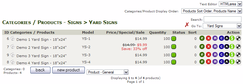 In the top right, you'll see a droplist for "Text Editor". This is used for editing your description. You can choose either Plain Text or HTMLarea. HTMLarea allows you to format the text like you would in a word processor and use bold or underline among other options. If you are familiar with formatting text, HTMLarea is a good option. The next droplist allows you to sort the list of products - this will be important as you add more products. Below this is the Search box, which is very useful if you have 1,000's of products and want to find just a single specific one. Below search is a droplist that lets you choose a Category and switch to it easily.